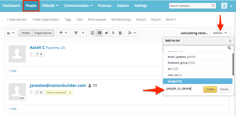 2. Add all of the people in your nation to a list. Navigate to People > Actions > Add all to list > + Create list. Name the list something like people_to_delete and then click Create.