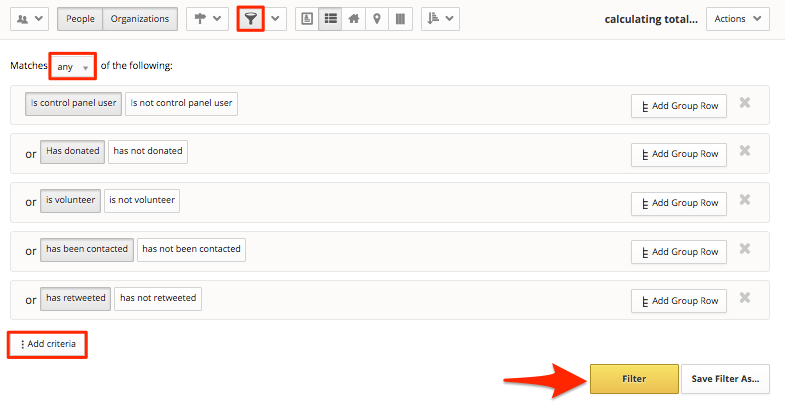 3. Next, click on the Filter button and Add criteria to find the people that you'd like to keep. Make sure to change "Matches all of the following" at the top to "Matches any of the following." Use filters like: