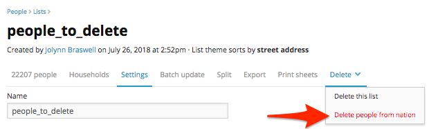 5. Now, click on Lists at the top of the page and select the edit button next to the list "people_to_delete." The list will open. Before you delete these people permanently, you may want to look over the list statistics in the overview by clicking on the # of people, just to be sure that it seems correct. If so, you will navigate to the Delete tab. Click on it and select Delete people from nation.